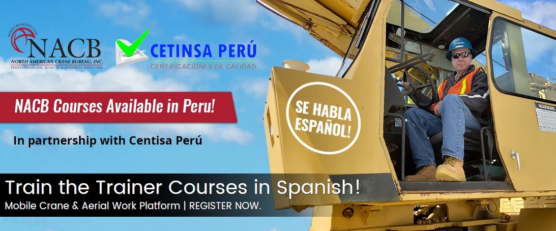 LIDERES EN INSPECCIONES Y CERTIFICACIONES EN EQUIPOS DE IZAJE DE CARGAS, CERTIFICACIONES DE OPERADORES Y MAQUINARIA PESADACURSO DE ENTRENAMIENTO Y CERTIFICACION INTERNACIONAL NACB TTT TRAIN THE TRAINER MOBILE CRANE & TTT TRAIN THE TRAINER AERIAL WORK PLATFORM CURSO EN ESPAÑOL INSTRUCTORES NORTEAMERICANOS DIRECTOS DE NACB INC